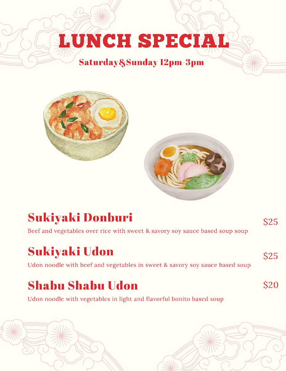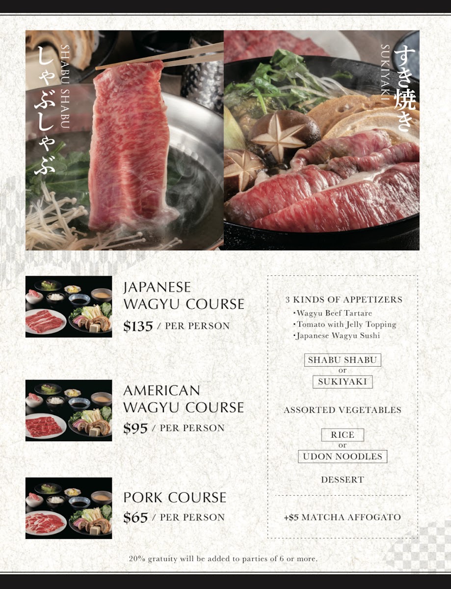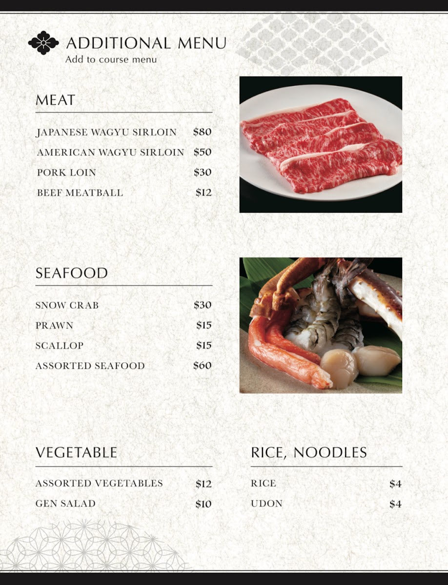 The menu at Sukiyaki Shabu Shabu GEN offers a refined yet approachable selection centered around Japanese hot pot classics like sukiyaki and shabu shabu. It’s designed for shared dining, perfect for intimate gatherings or relaxed evenings where the focus is on enjoying quality ingredients slowly cooked at the table.